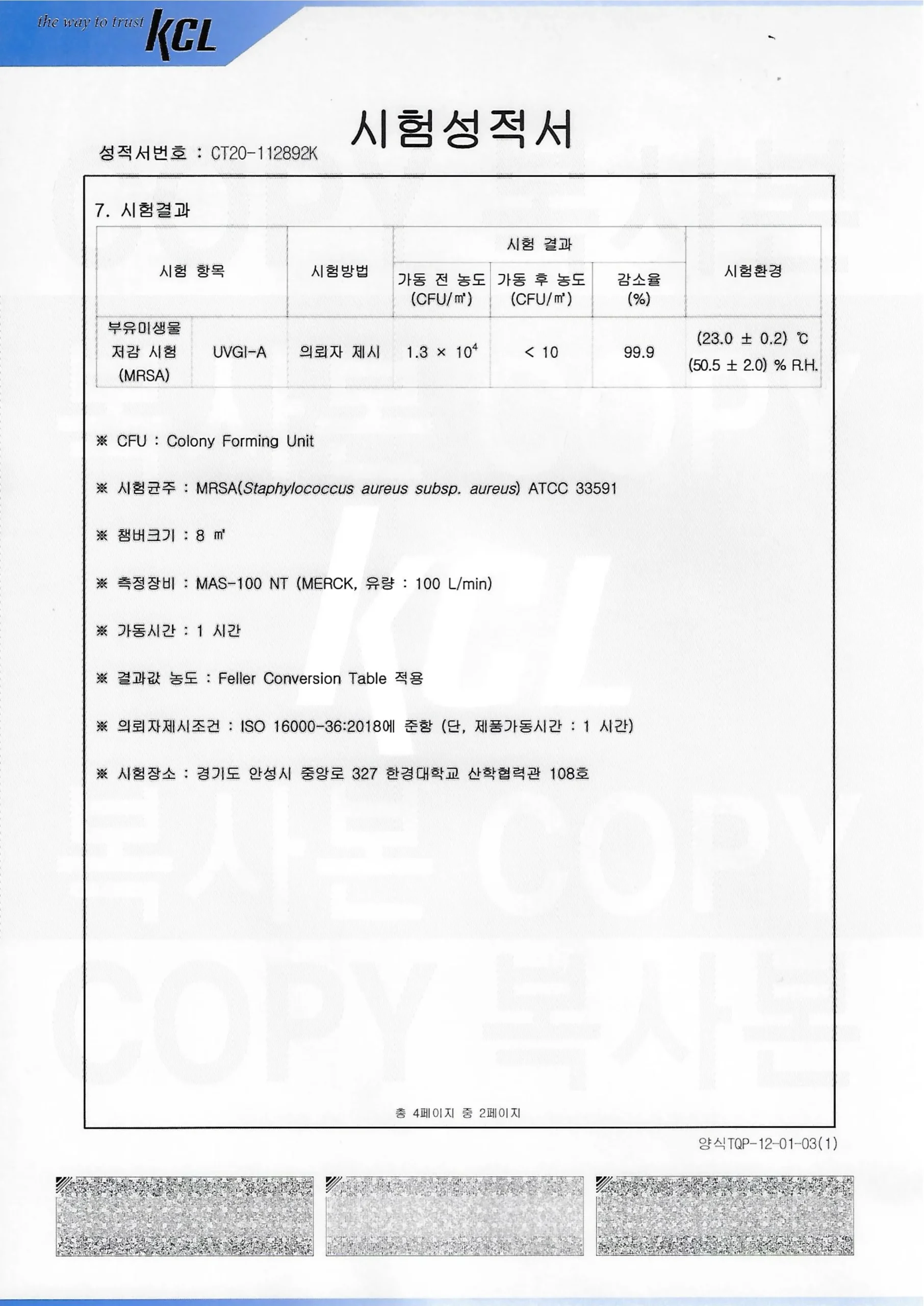 • 부유미생물 저감 시험 (MRSA)